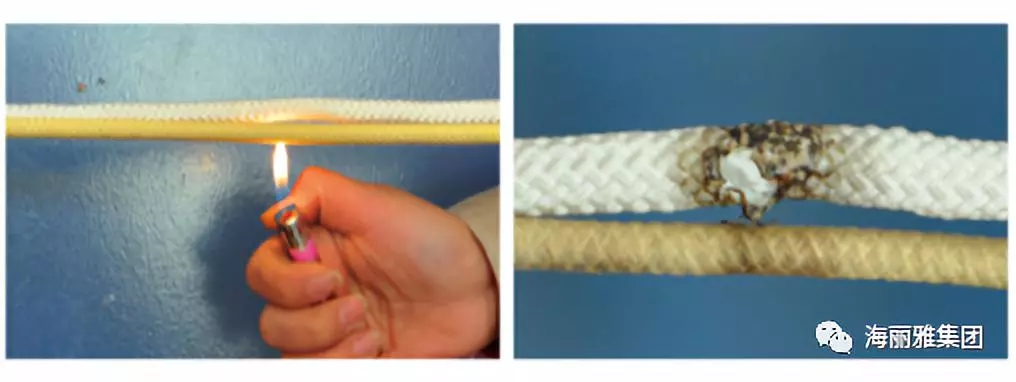 公司研發(fā)的防火逃生繩(黃色)與普通材料逃生繩(白色)防火實(shí)驗(yàn)對比