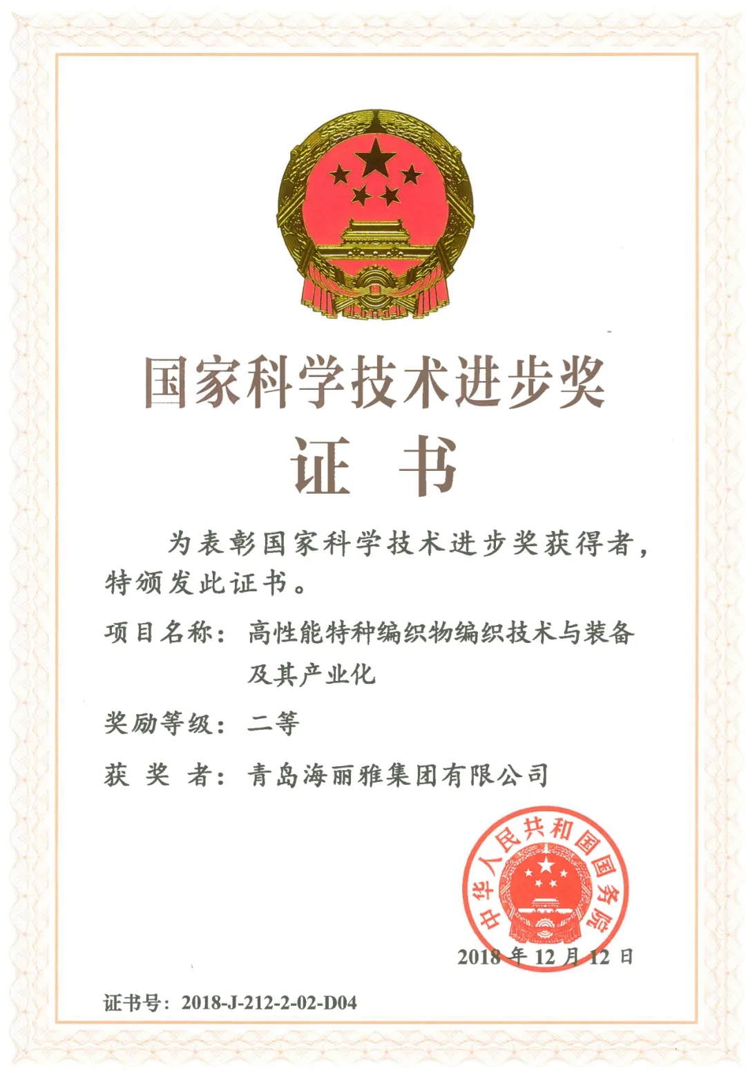 青島海麗雅集團(tuán)·華凱海洋科技有限公司研發(fā)的“高性能特種編織物編織技術(shù)” 斬獲國家科技進(jìn)步獎二等獎。
