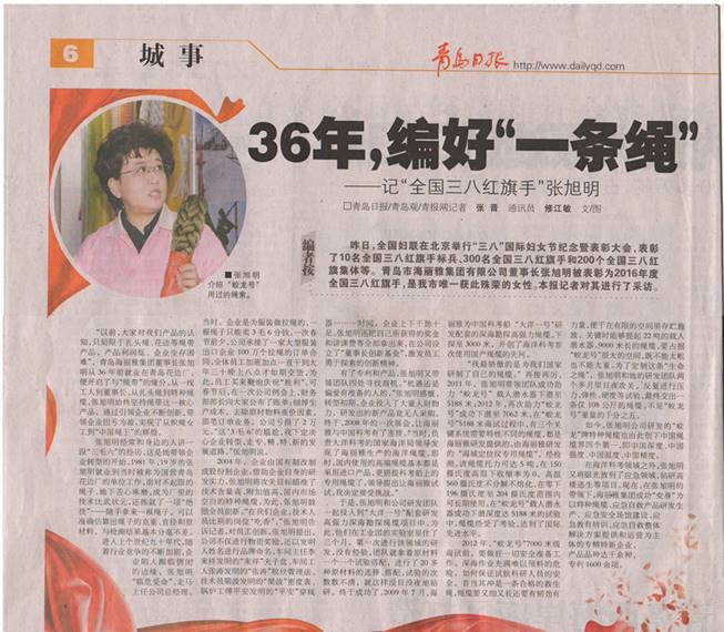 “業(yè)精于勤,荒于嬉;行成于思,毀于隨”,用在張旭明身上最貼切。36年的光陰,張旭明毫不吝嗇的奉獻給海麗雅,從織繩女工到“中國繩王”,這背后砥礪前行的痛楚也只有她自己最清楚。但是,路漫漫其修遠兮,張旭明會一直秉持“大國匠心”的理念,將繩纜產(chǎn)業(yè)做到極致,要讓自己的繩纜走出國門,站在世界的舞臺上,為國爭光!