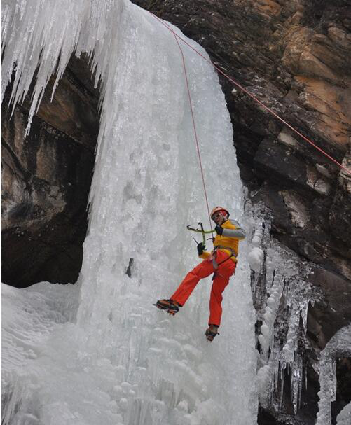 圖為:公司研發(fā)生產(chǎn)的“蛟龍”登山繩助力“雪山之吻”登山隊征服水簾洞冰壁
